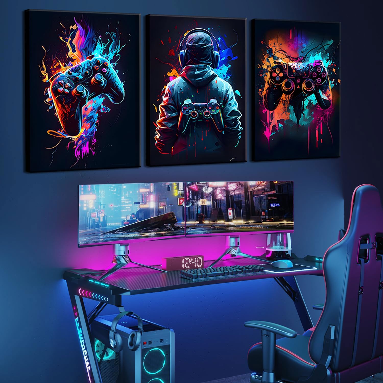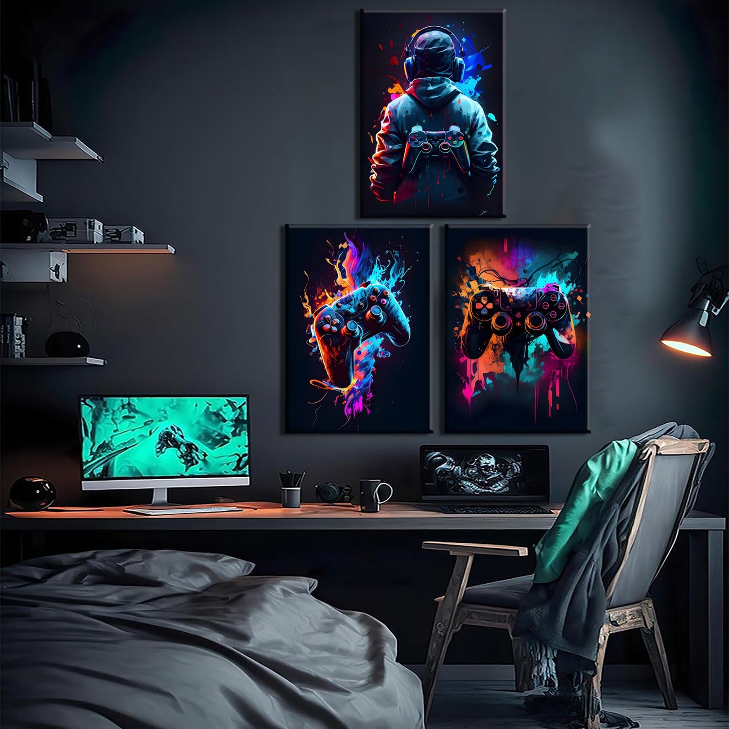 - 【Gaming Wall Decor】- Teens Boys Girls Gamer Room Accessories And Decor. This Set Of Gaming Wall Art Features Bright Watercolor Vision, Completely Match The Atmosphere Of The Room Of Video Game Fans,With The Cyberpunk Style Gamepad Picture,Cool Wall Decorations To Hang In Living Room, Bedroom, Playroom, Game Room, Computer Room, Nursery, Gamer Bedroom, Even Study Room, School Dorm, Bar, Men Cave, Apartment Etc.