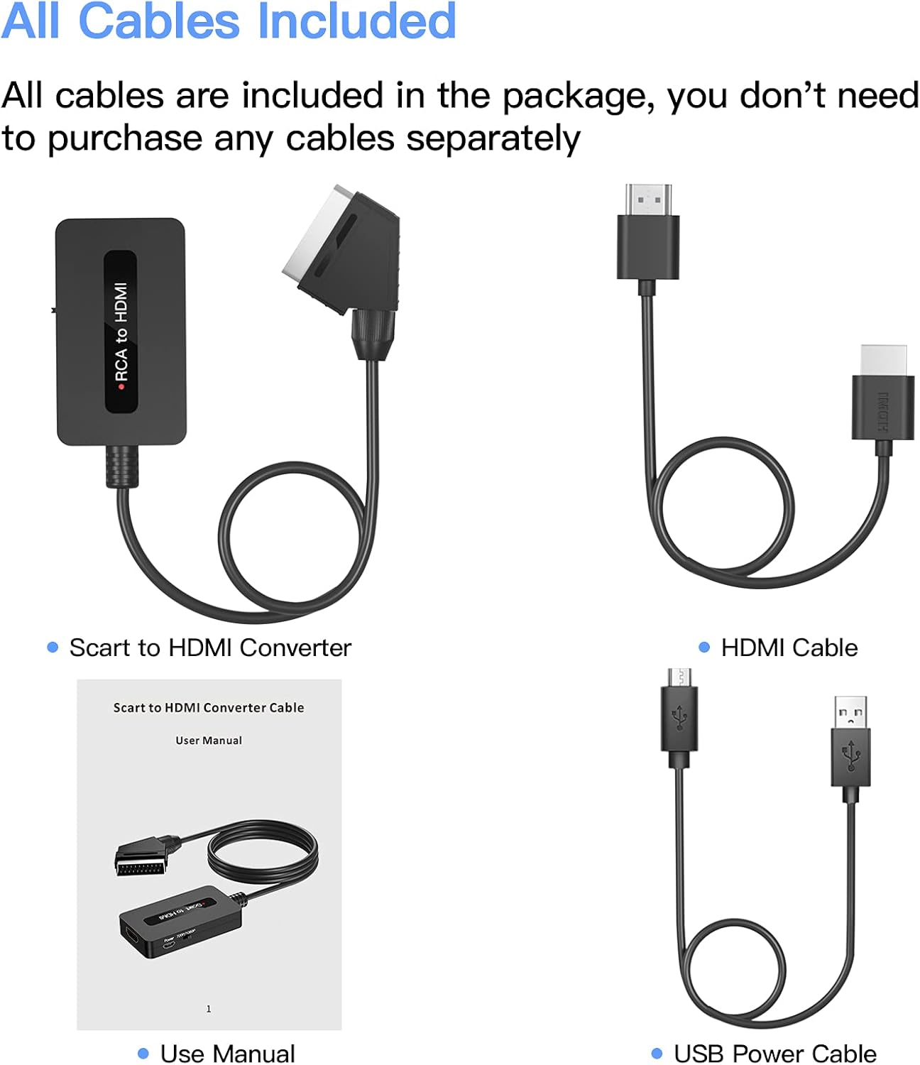 - 【Cost-effective】 You don’t need to purchase extra cables separately, all cables are incldued in the package of this Scart to HDMI converter: 1x Scart to HDMI converter; 1x HDMI cable; 1x Scart cable, 1x USB power cable, 1 x user manual.