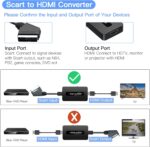 - 【Full HD 720P/ 1080P Output】This Scart to HDMI converter supports multiple TV formats input. With the integrated scaling technology inside, it automatically detects and converts Scart signal into HDMI 720P/ 1080P full HD output.