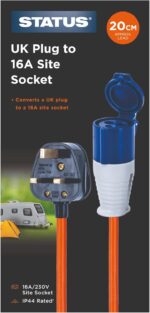 - WEATHERPROOF & DURABLE ADAPTER CABLE: This Status UK Plug to 16A Site Socket Adapter Cable features an IP44 rating, ensuring protection against dust and water. Perfect for camping, caravans, and motorhomes, this weatherproof adapter is built to withstand harsh outdoor conditions, making it a reliable choice for outdoor adventures and construction sites.