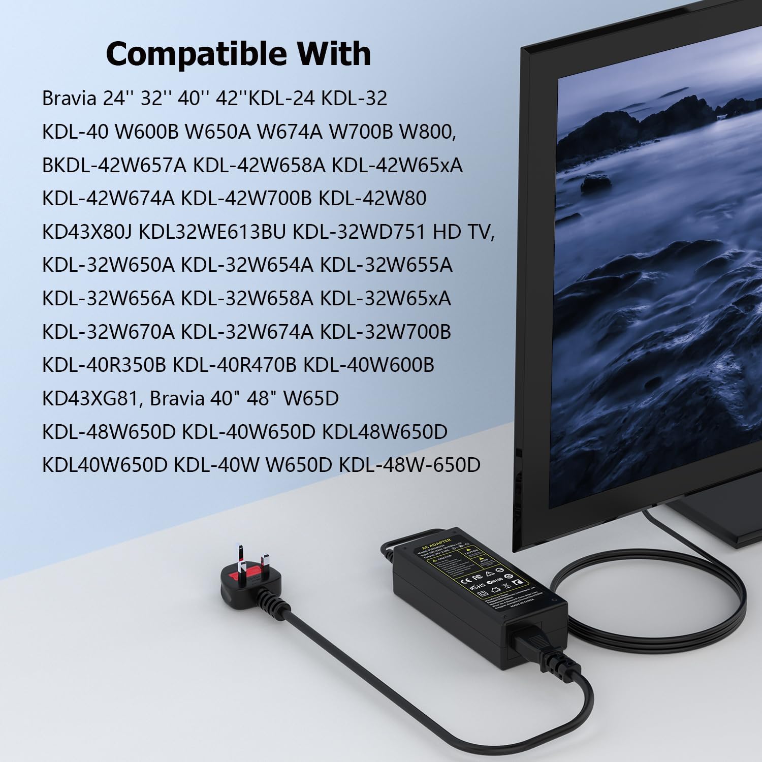 - VUOHOEG Charger Compatible with Sony Bravia TV Power Cable: 24” 32” 40” 42”KDL-24 KDL-32 KDL-40 W600B W650A W674A W700B W800, BKDL-42W657A KDL-42W658A KDL-42W65xA KDL-42W674A KDL-42W700B KDL-42W80 KD43X80J KDL32WE613BU KDL-32WD751 HD TV, KDL-32W650A KDL-32W654A KDL-32W655A KDL-32W656A KDL-32W658A KDL-32W65xA KDL-32W670A KDL-32W674A KDL-32W700B KDL-40R350B KDL-40R470B KDL-40W600B KD43XG81, Sony Bravia 40″ 48″ W65D KDL-48W650D KDL-40W650D KDL48W650D KDL40W650D KDL-40W W650D KDL-48W-650D